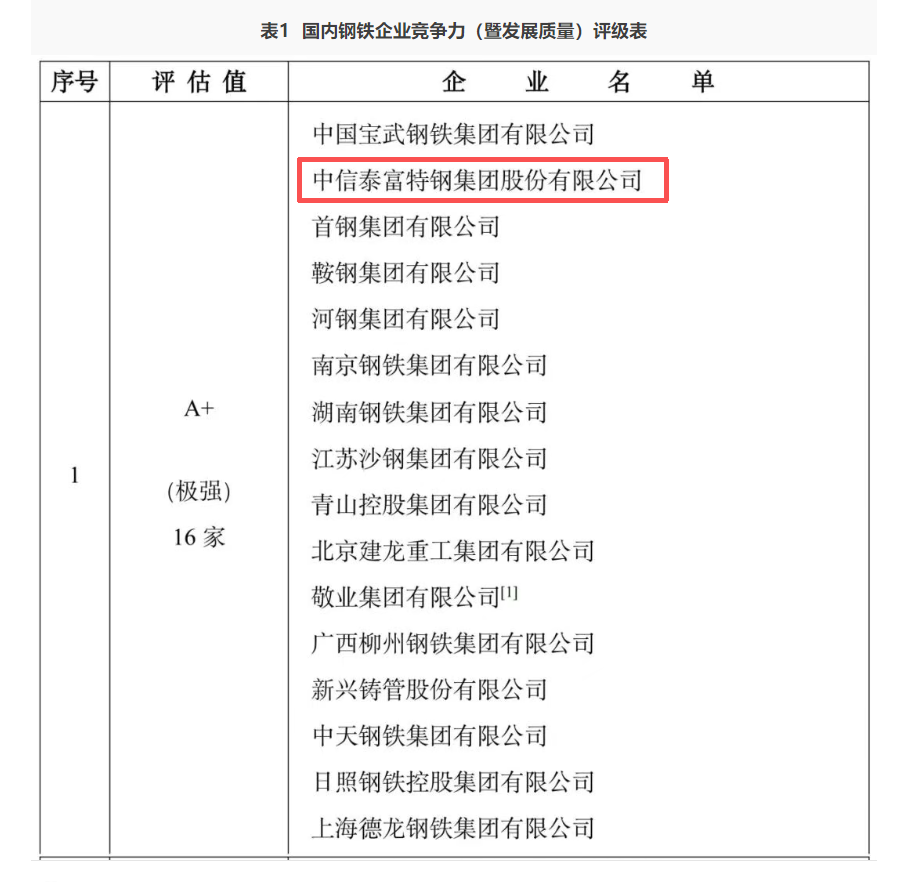 12月19日,冶金工业规划研究院发布 “2025国内钢铁企业竞争力(暨发展质量)评级研究成果””2025国内钢铁企业ESG评级研究成果”。中信泰富特钢连续多年获评竞争力A+(极强)评级、ESG AAA级评级。