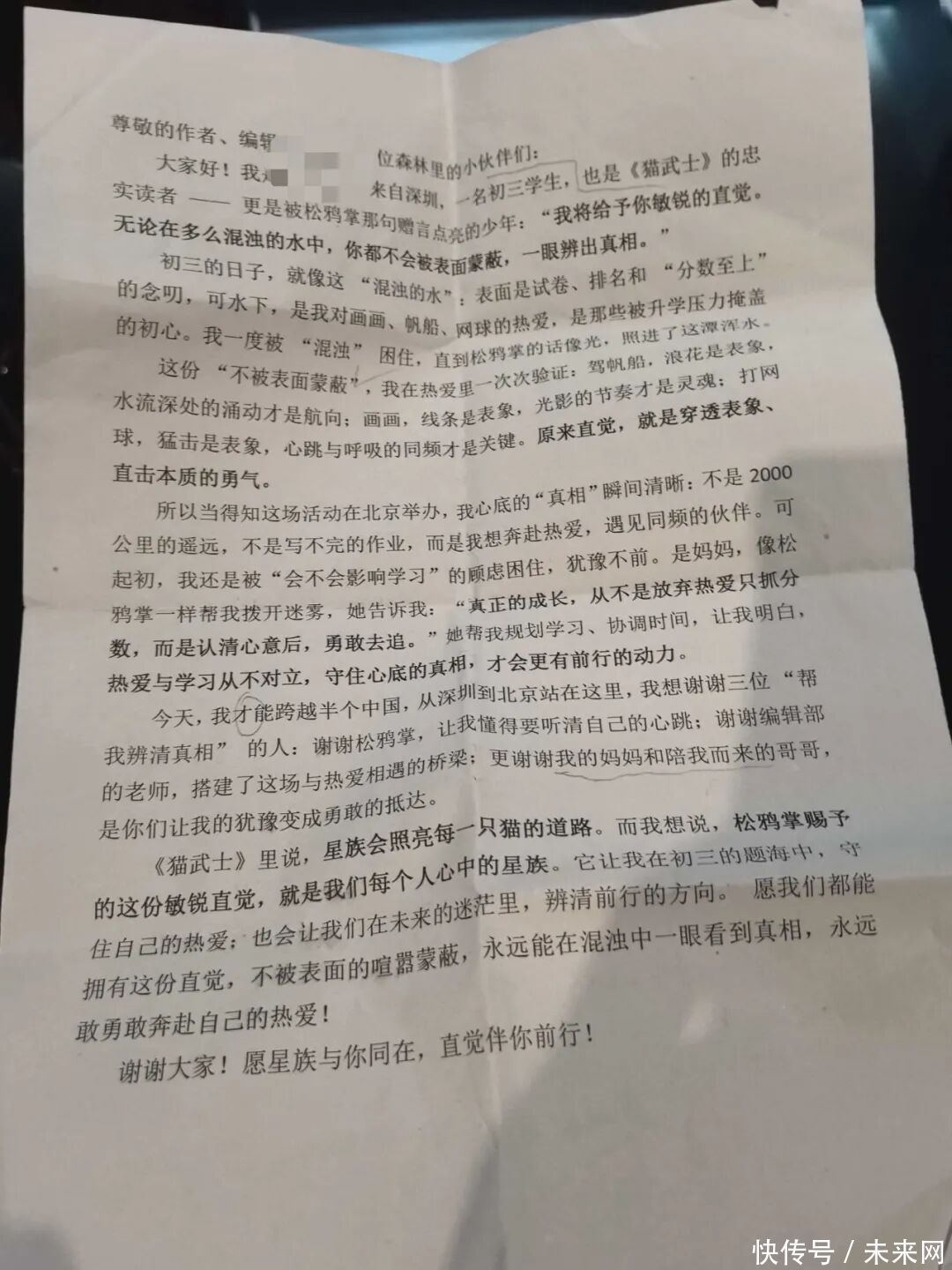 来自深圳的“猫迷”说,《猫武士》中松鸦掌说的那句“我将给予你敏锐的直觉,无论在多么混浊的水中,你都不会被表面蒙蔽,一眼辨出真相。”将他的生活点亮,让他的初三生活有了盼望。他还说:“谢谢我的妈妈和陪我而来的哥哥,是你们让我的犹豫变成勇敢的抵达。”